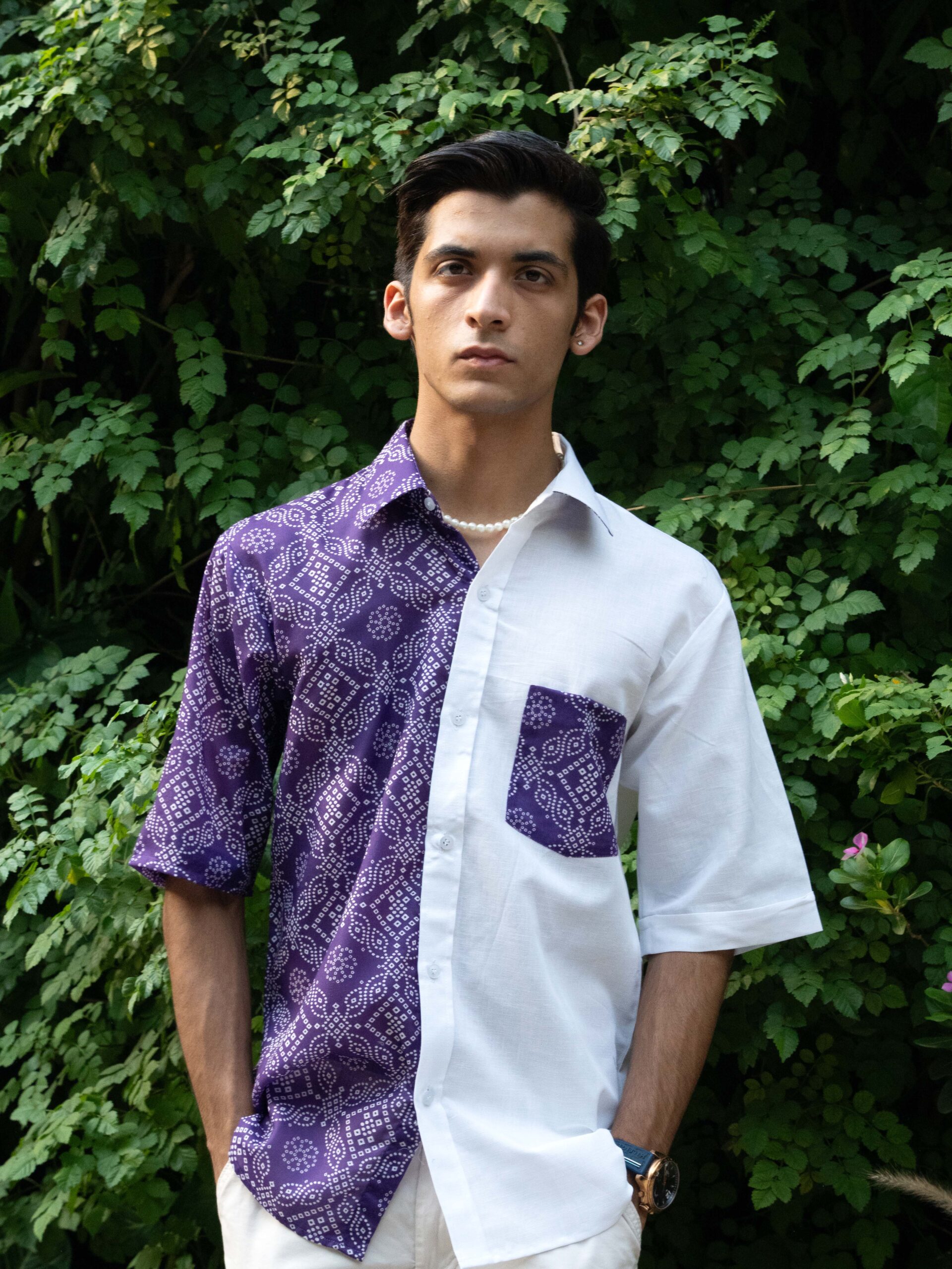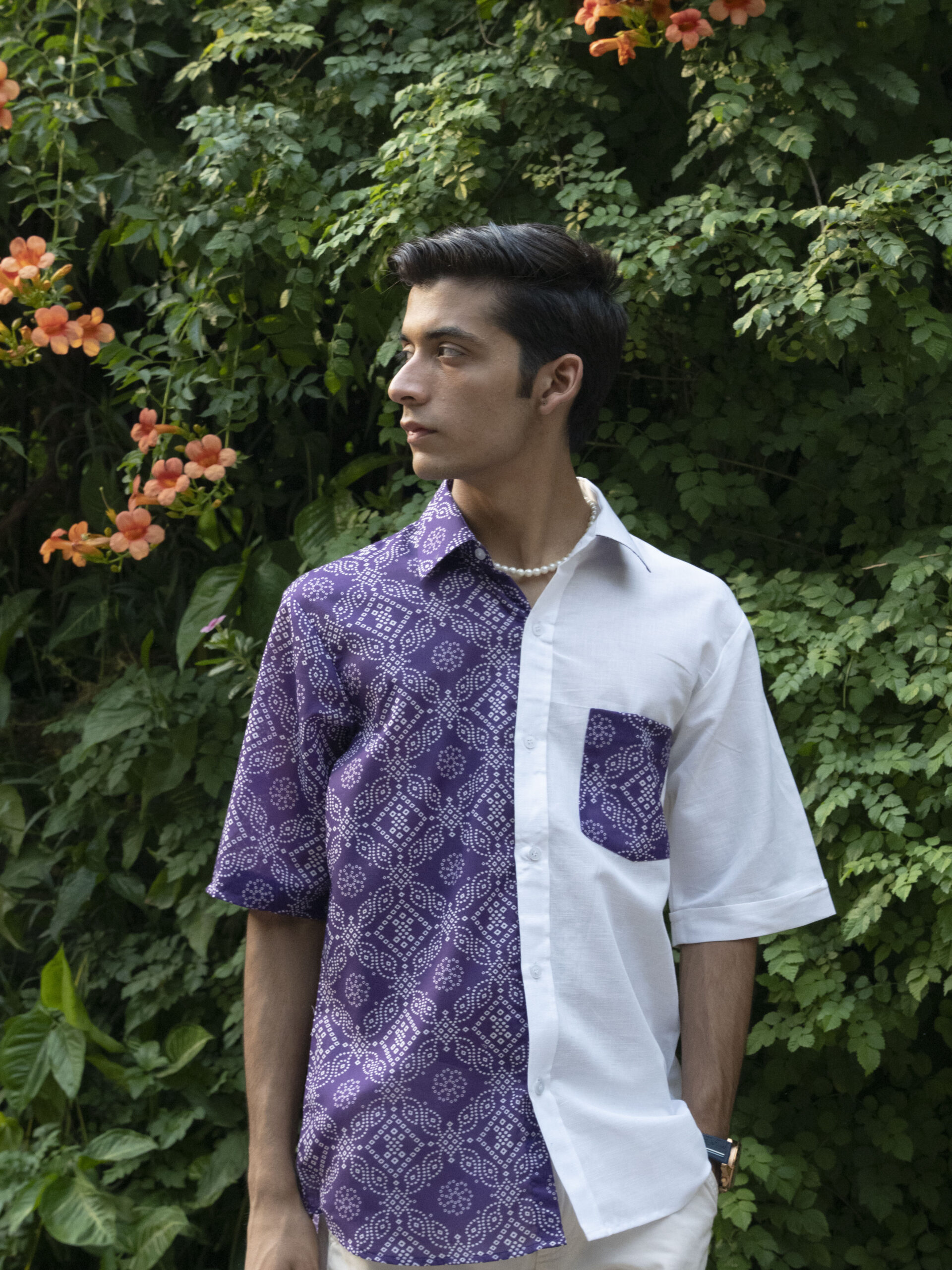 - Colour & Pattern: Half Purple Half White details provides a versatile backdrop for the unique box-fit design, making it a standout piece.