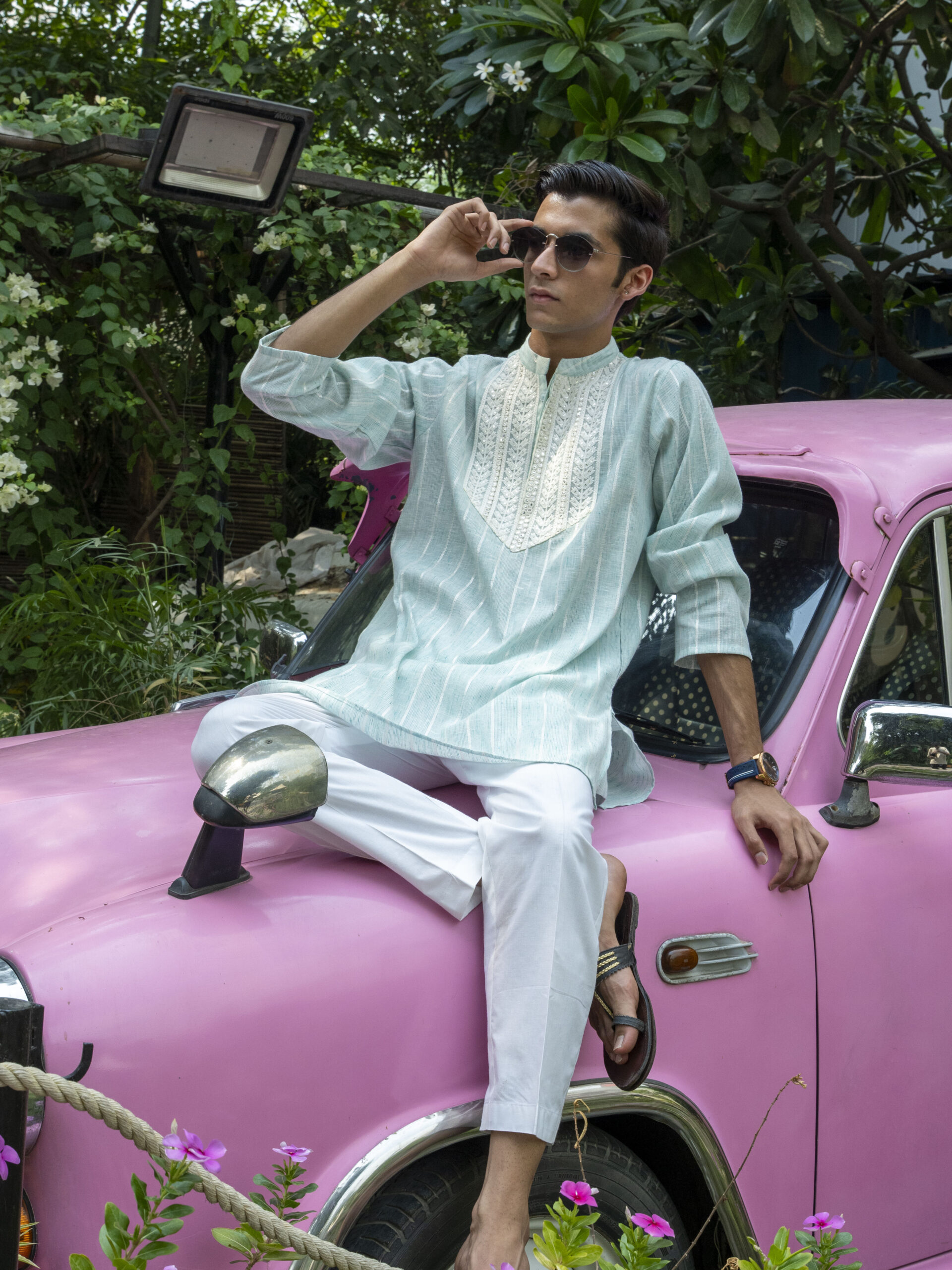- Pattern & Silhouette: A straight fit kurta with a centre slit, paired with crisp white pants, strikes the perfect balance between classic and modern.