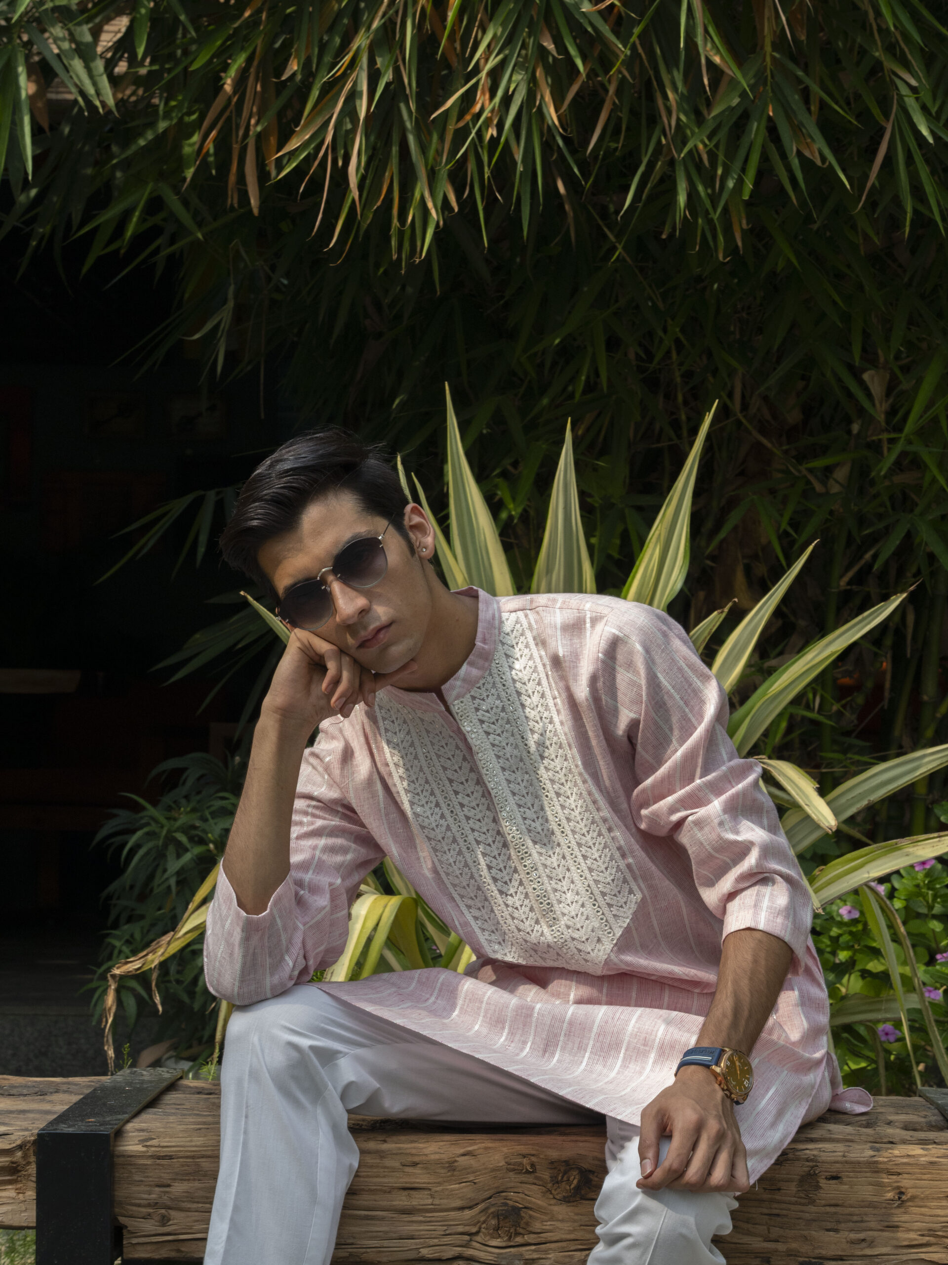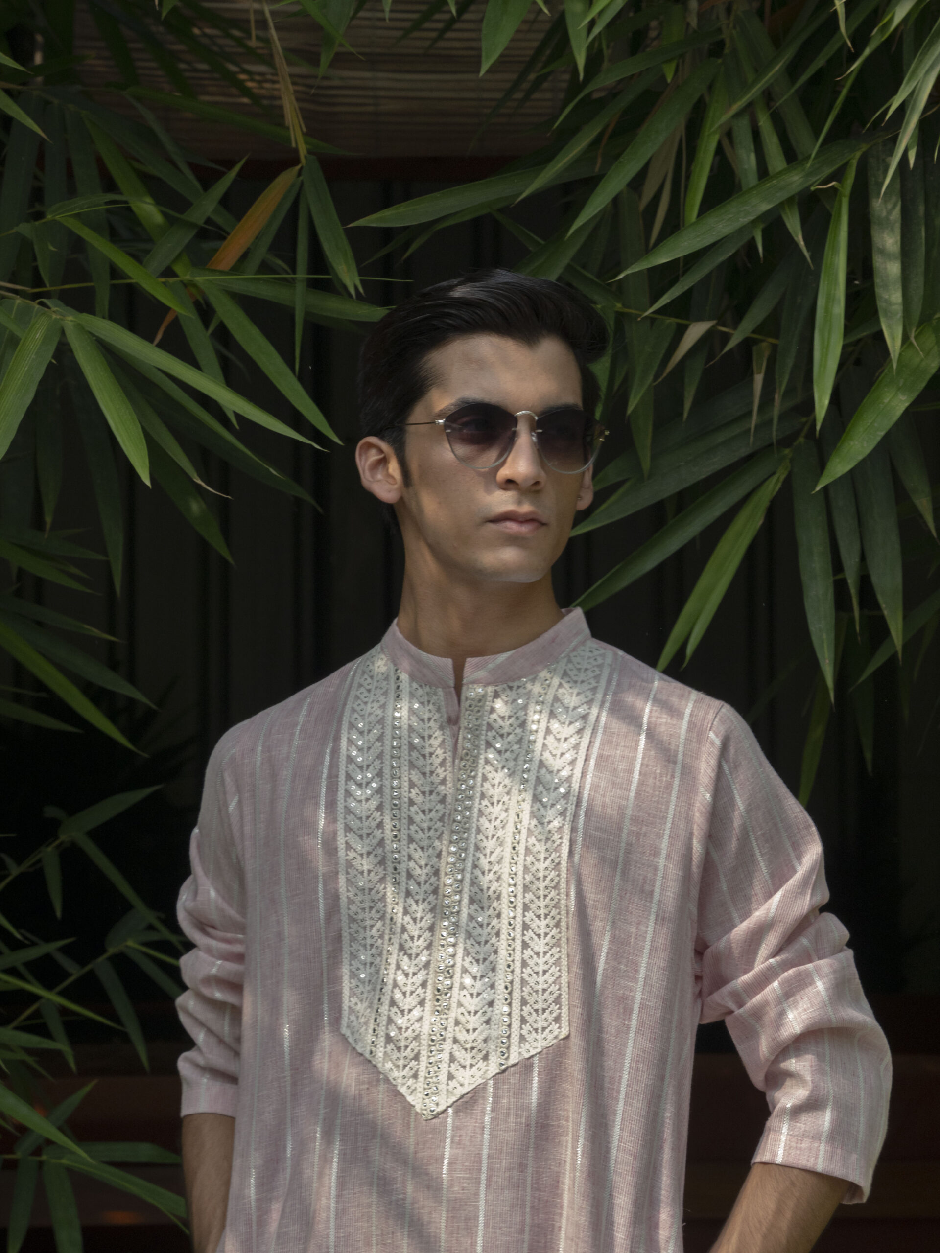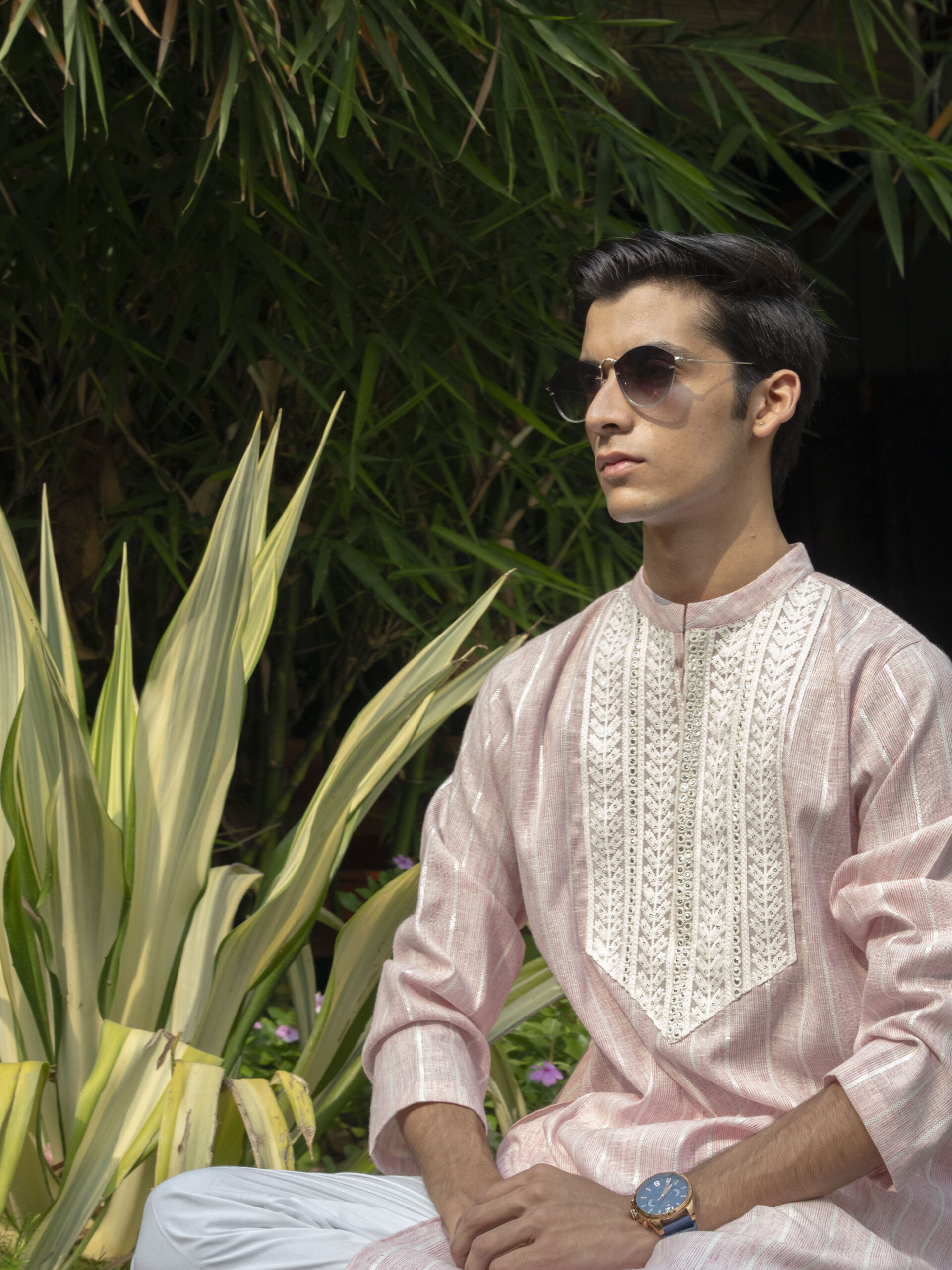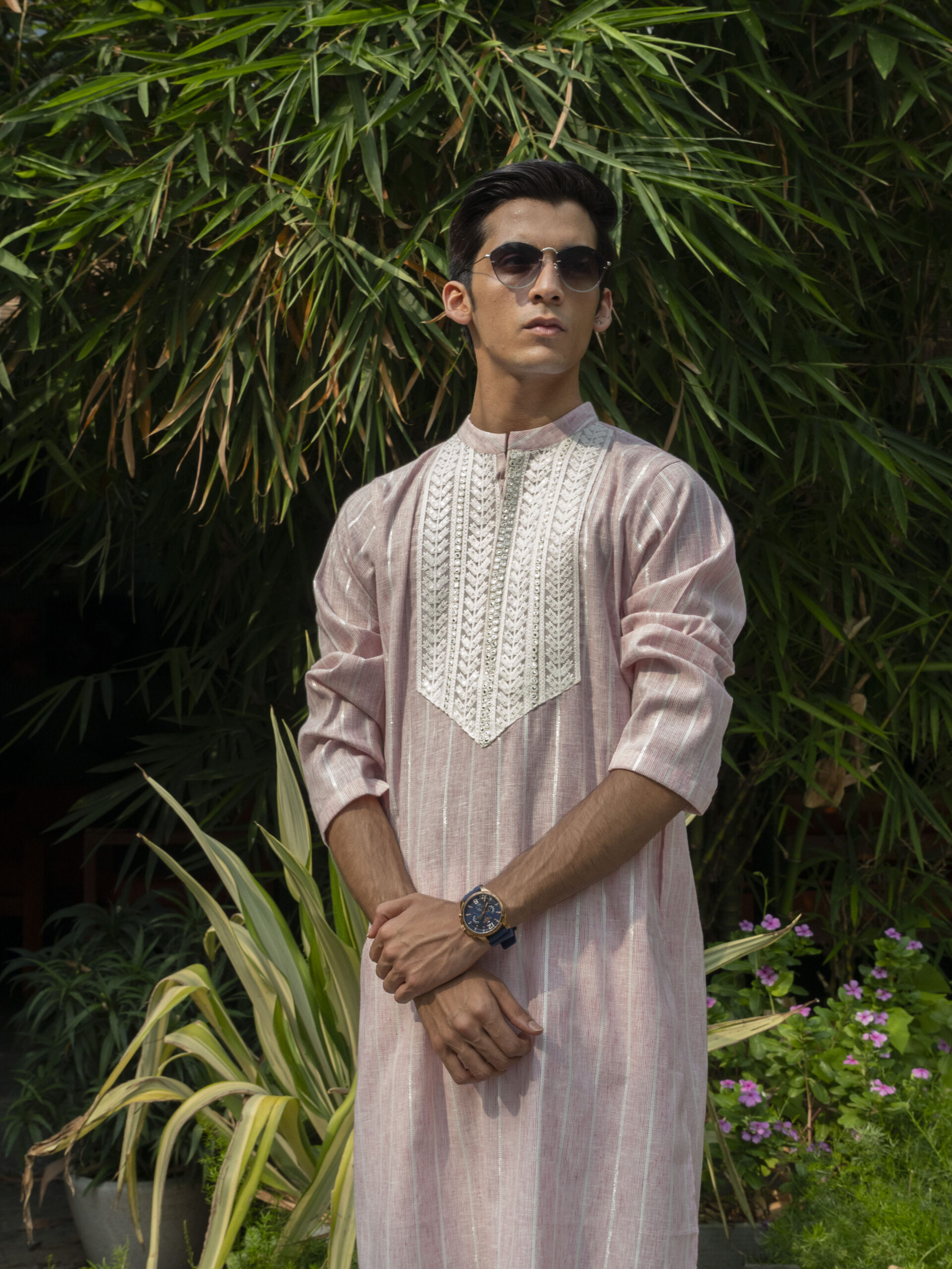 Step into the season of celebrations with Hastakshar’s Pastel Pink Kurta, a garment that beautifully fuses traditional charm with modern elegance. Designed for the man who carries his heritage with pride, this kurta is a testament to impeccable style and comfort.