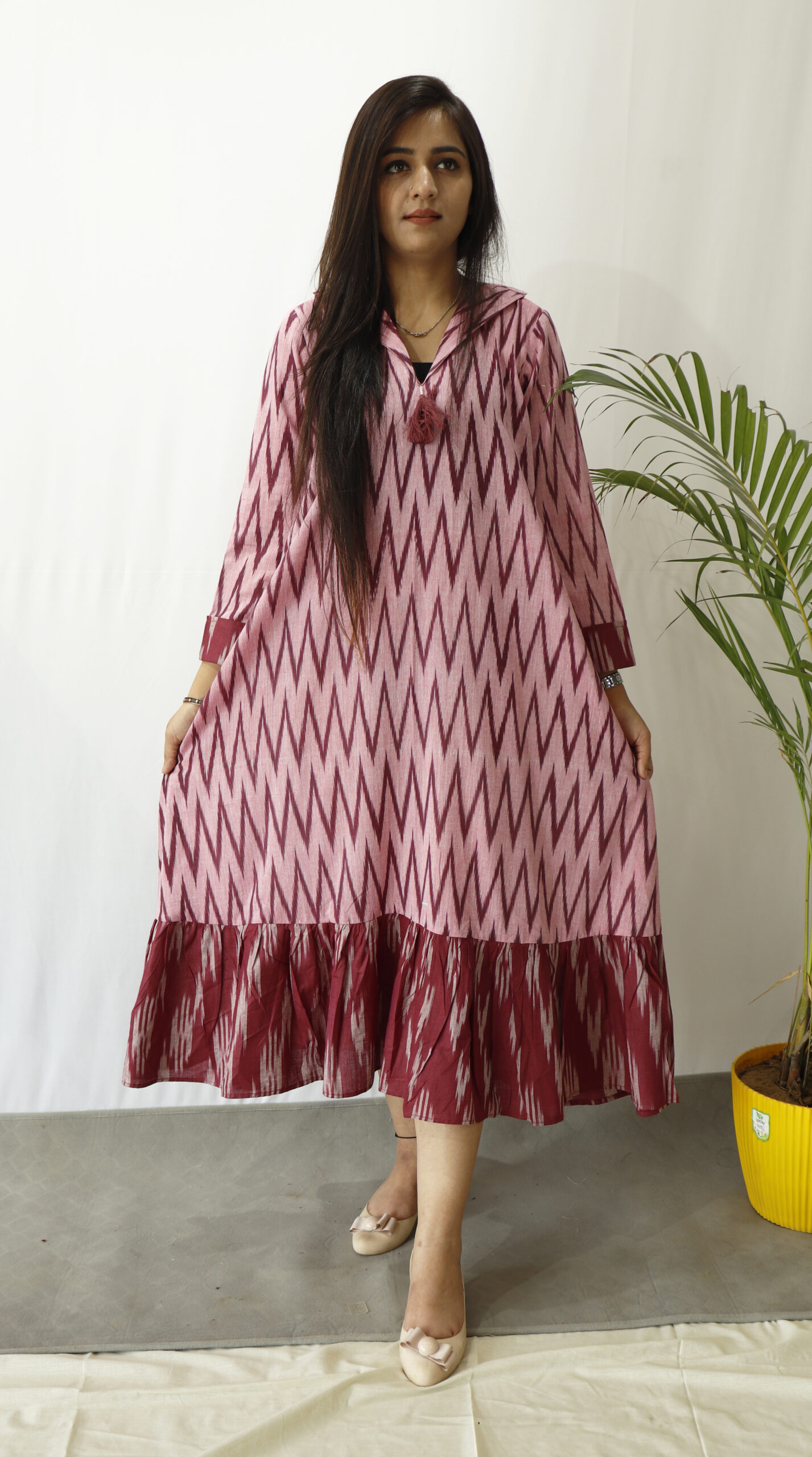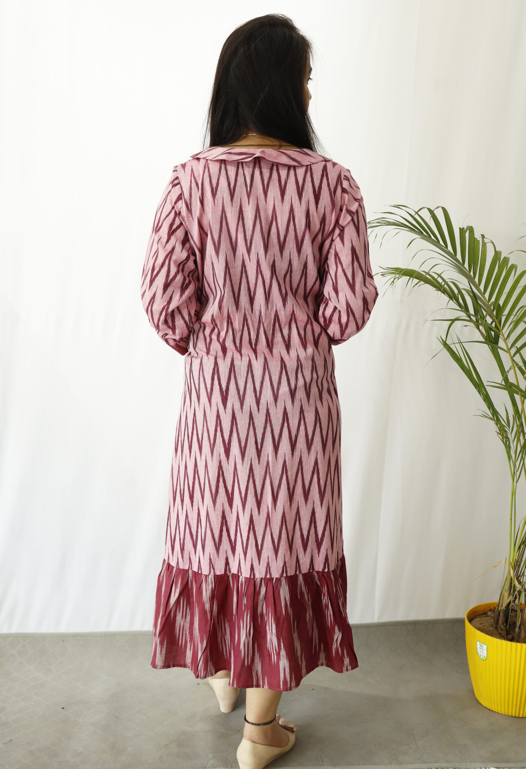 - Shape: Flared with frills on the hem